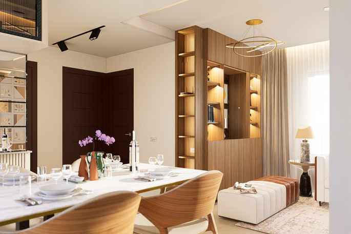 Abharana is a thoughtfully designed 2BHK apartment located in Hennur. The interiors feature a soft beige palette paired with dark wooden laminates, creating a timeless and elegant look. Warm lighting highlights key spaces, adding a cozy and inviting atmosphere. The design balances modern functionality with a subtle touch of luxury, making it ideal for comfortable urban living.